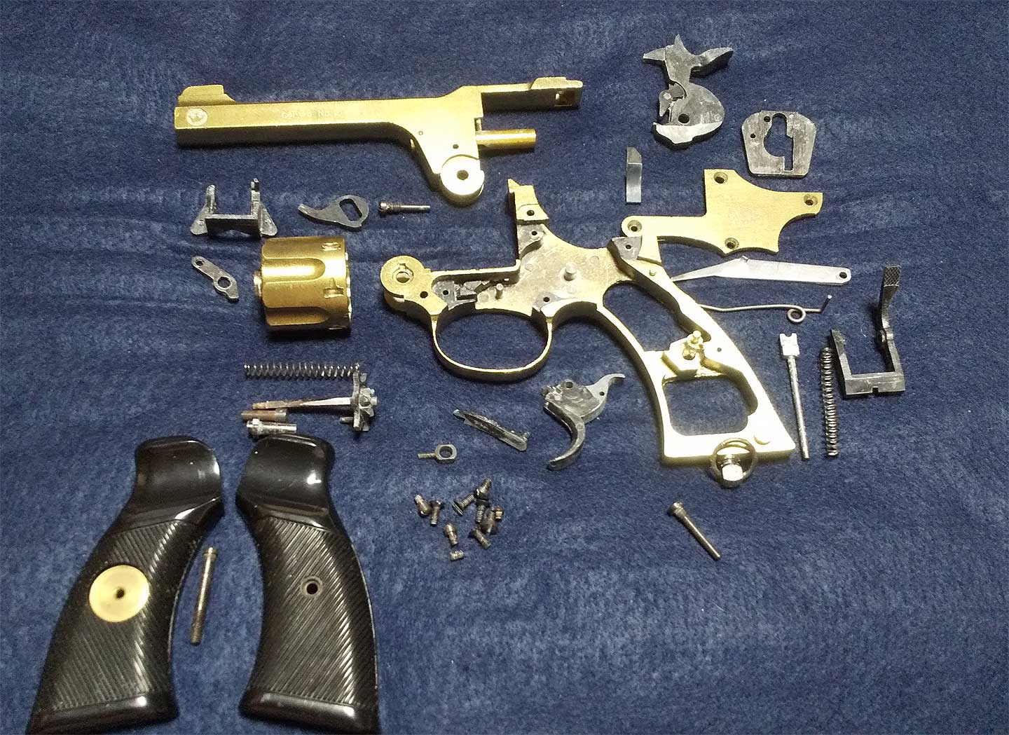 内部のメカも複雑そうですね。繊細メカ機構は、コルトパイソンのご先祖様のような感じです。 リバウンドメカは、組み込まれていません。すべてのバランスが完璧に取れていないと、まともに動かない「パイソン式システム」は、モデルガンには向きません(実銃のコルトでも欠点です)。