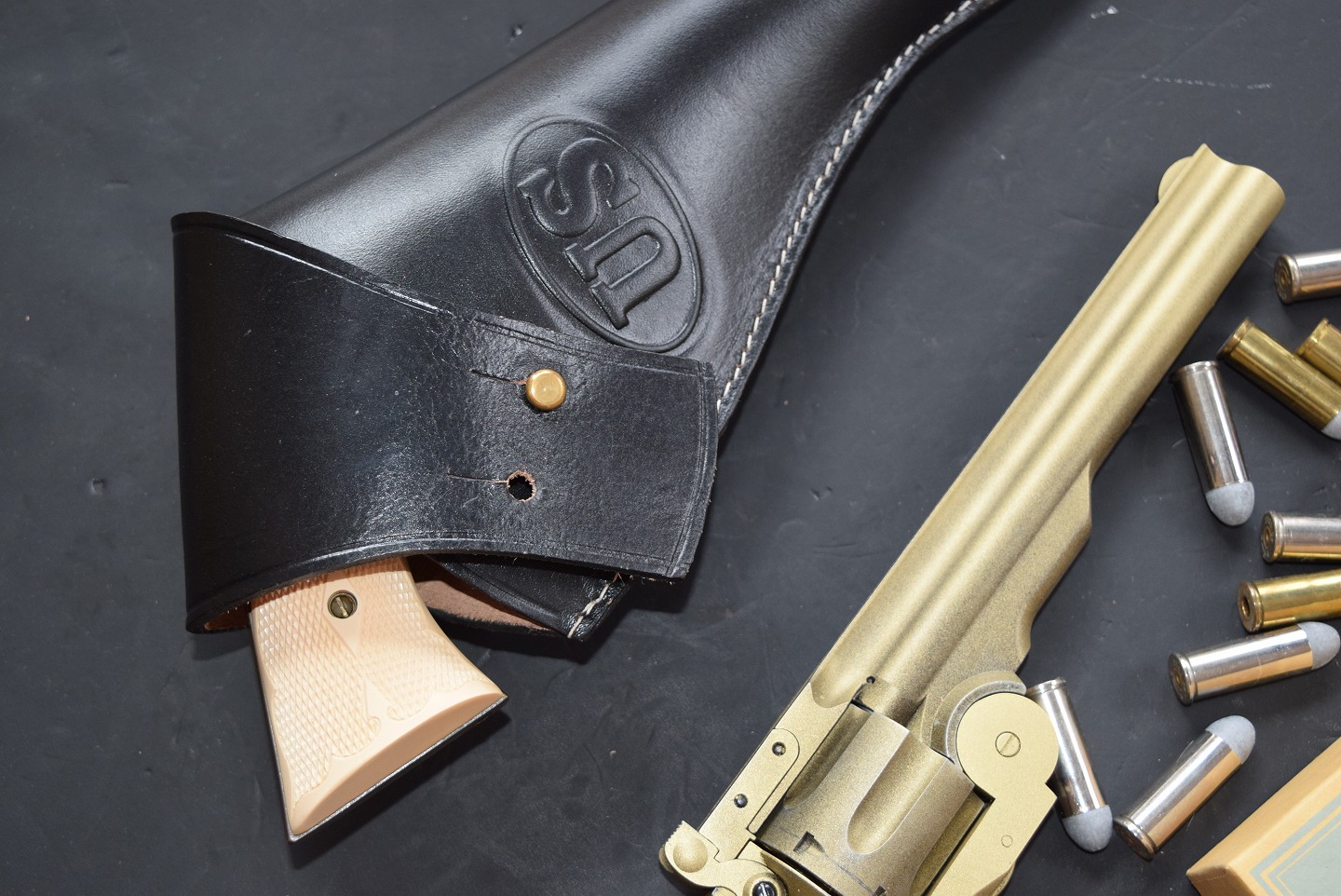 騎兵が馬上で片手で操作できるようにフレーム側にロック機構を設けたものです。また、その際にコルトSAA と同じく口径を45口径にも変更しました。