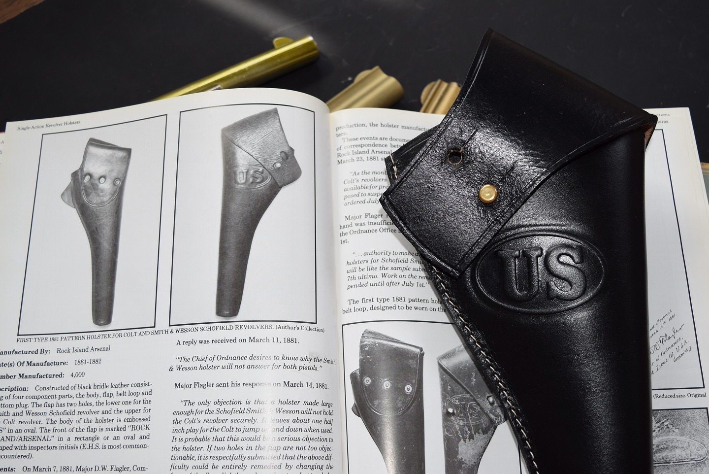 数年後にコルトのSAA も採用されましたので、このころはコルト、S&W 両者ともに米軍制式拳銃でした。 よってホルスターもどちらにも使えるようにとフラップのギボシ用の穴が2ヵ所開いていました。 それが1881ホルスターです。