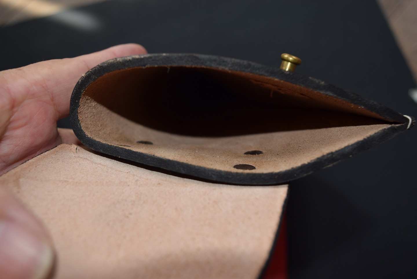 レプリカホルスターは右腰用です。裏側のリベットは手抜きで2個しかありませんが、実物はほとんどの物が 3個から5個のリベットがあるようです。 書籍の図にあるように内側の穴がコルト用で外側がS&W 用です。
