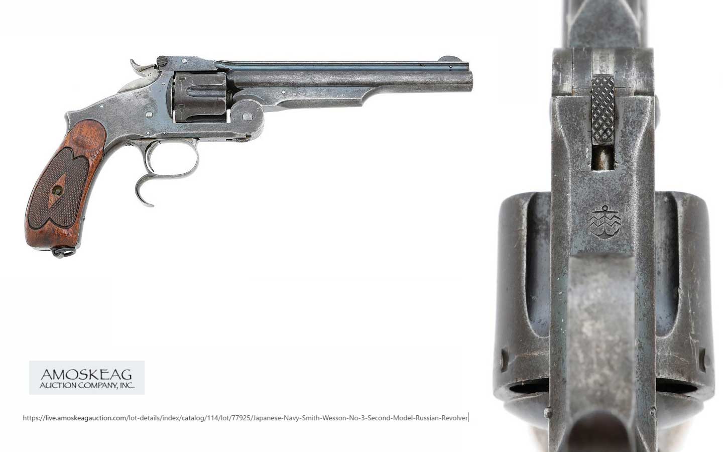日本軍は1878年(明治11年)ごろからSW No.3 モデルを購入したようで、はじめはラシアンでそのうちニューモデルも購入しています。 上写真は左がラシアン・セカンドモデルで右はニューモデルです。どちらも海軍の錨マークが打刻されています。