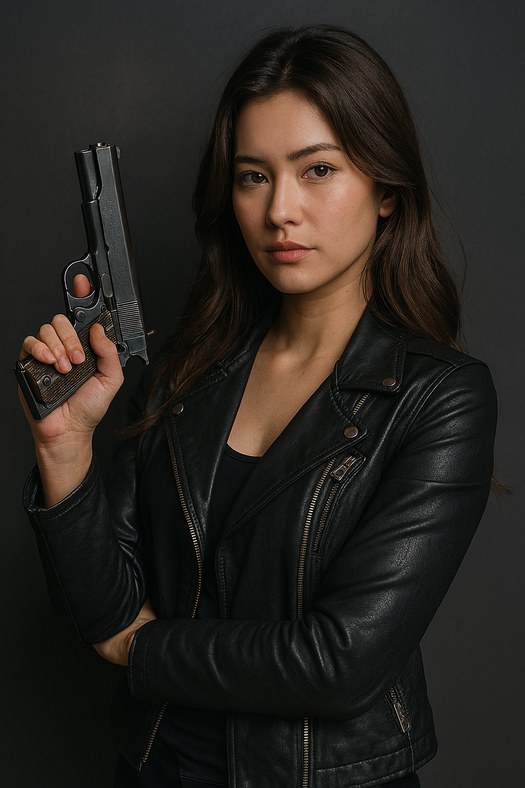 どうしても多数意見として拳銃を持つ女性は、革ジャンを着ているようです。 あとは好みで髪形を変えたり東洋系にしたりと色々と出来る事でしょう。