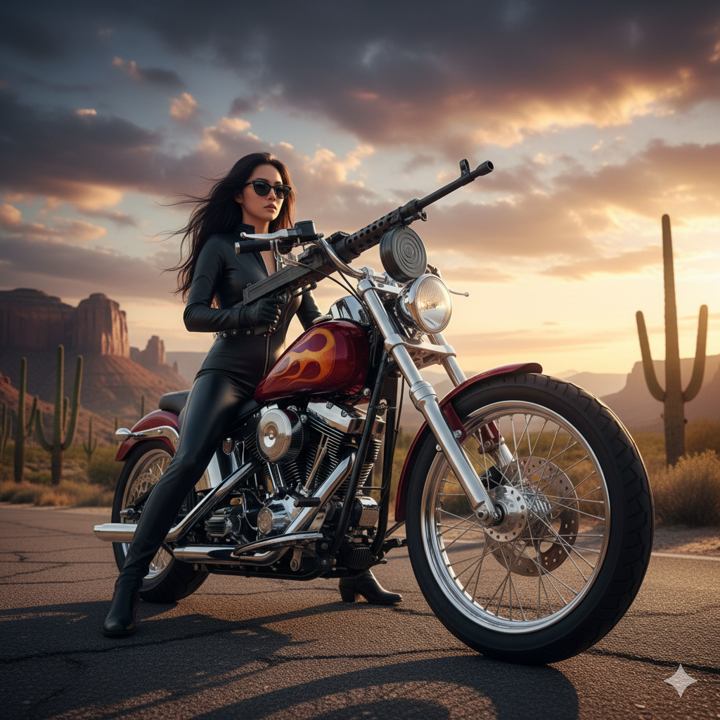 こちらは、ハーレーにまたがり機関銃を構える女性という命令で作ってもらったgoogle ジェミニ作品ですが、