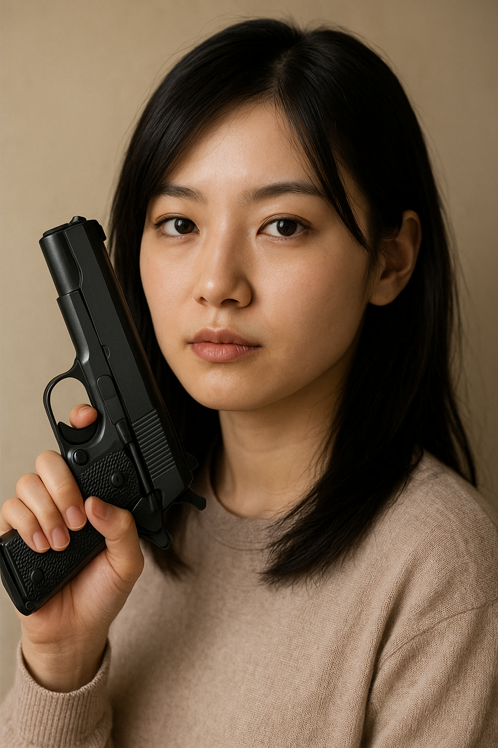 右は、ChatGPT にgoogle アカウントでログオンして「コルトガバメントを顔の近くで持つ日本人女性を生成」 というお題を投げましたが、顔の近くで銃を持つのは危ないからと断られたので、コルトガバメントのモデルガンを顔の近くで持つ日本人女性を生成 に変えて出来た画像です。生成時間は長いですね、google ジェミニ が最も画像の生成が早いです。